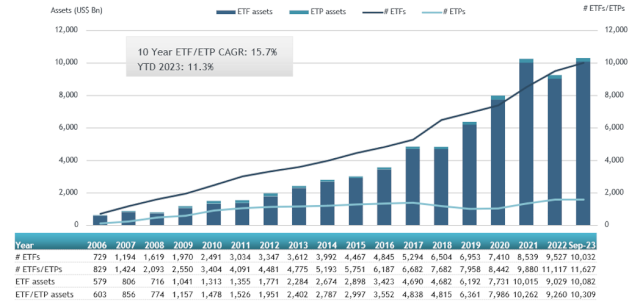 The Global ETFs industry had 11,627 products, with 23,560 listings, assets of $10.31 trillion, from 710 providers listed on 80 exchanges in 63 countries at the end of September.
