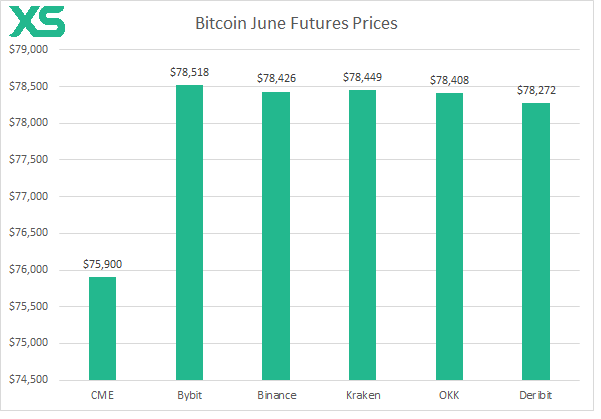 The following chart illustrates the prices of Bitcoin June futures across some of the most prominent exchanges: